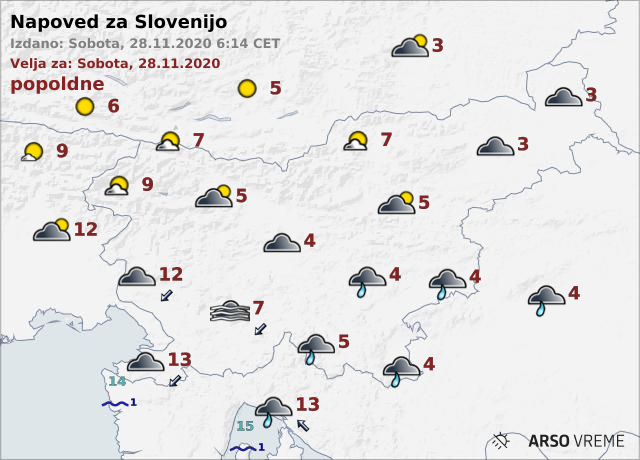 Danes bo v južni in osrednji Sloveniji oblačno, čez dan se bo nekoliko pooblačilo tudi v severnih krajih, kjer bo dopoldne marsikje po nižinah še megla ali nizka oblačnost. Popoldne bo na jugu začelo rahlo deževati. Zvečer bo na Primorskem začela pihati burja. Najvišje dnevne temperature bodo od 3 do 7, na Primorskem do 13 stopinj Celzija.