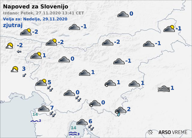 Ponoči bo ponekod v južni Sloveniji rahlo snežilo, do jutra bodo padavine večinoma ponehale. Najnižje jutranje temperature bodo od -2 do 2, na Primorskem ob burji okoli 6 stopinj Celzija.
