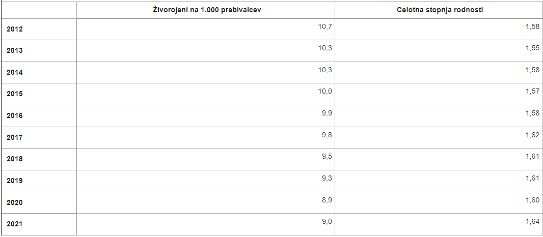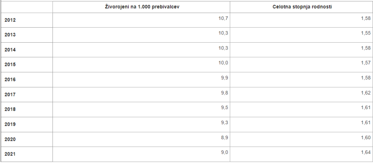Se je pa zvišala celotna stopnja rodnosti, saj je iz 1,58 leta 2012 zrasla na 1,64 v letu 2021. Stopnja rodnosti se je tako po podatkih Statističnega urada Republike Slovenije v desetih letih povečala za 0,06.