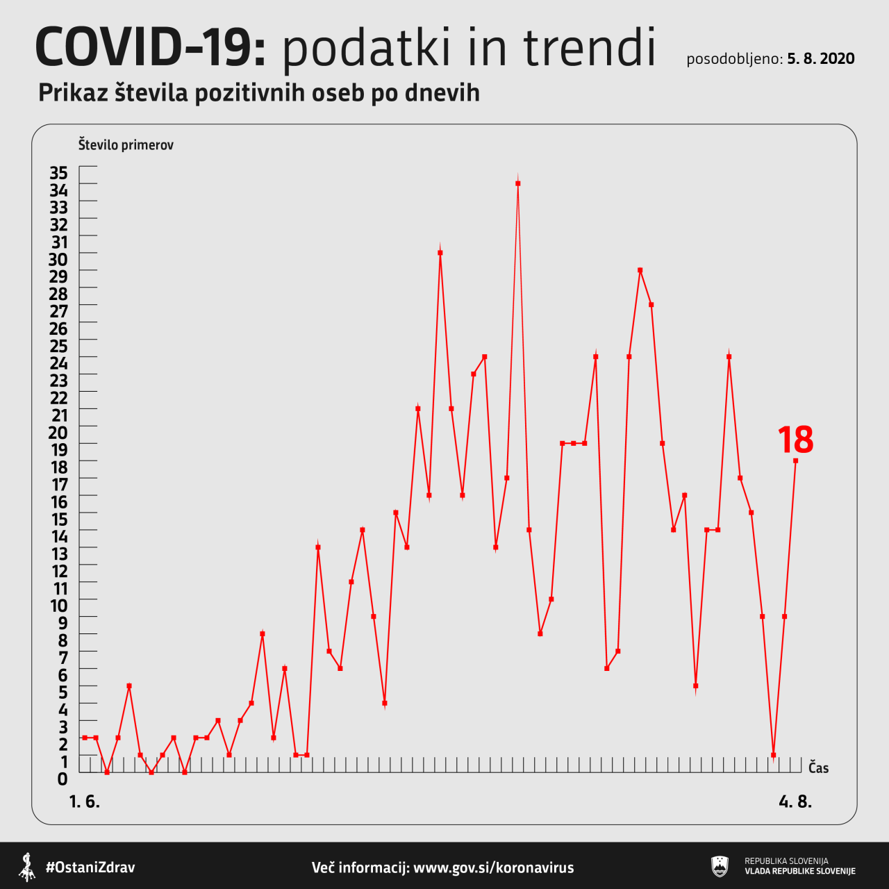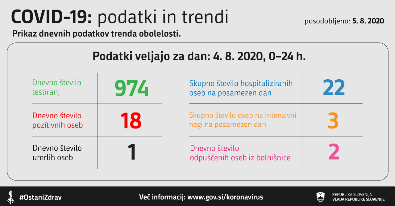 Včeraj, 4. avgusta, so v Sloveniji opravili 974 testiranj na novi koronavirus. Potrdili so 18 novih okužb s koronavirusom.