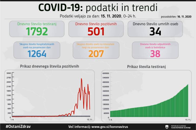 V Sloveniji so v včeraj, 15. novembra, opravili le 1792 testiranj na koronavirus in potrdili 501 novo okužbo, delež pozitivnih je bil kljub temu relativno velik, in sicer 28-odstoten.