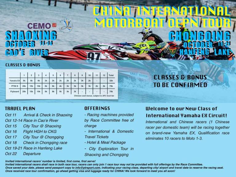 Tekmovanje, na katerem nastopa 20 najboljših tekmovalcev na sedečih vodnih skuterjih (jetski) iz vsega sveta, se bo odvijalo v Šanghaju, Shaoxingu in Chongqingu. v vsakem mestu bodo potekale po štiri dirke.