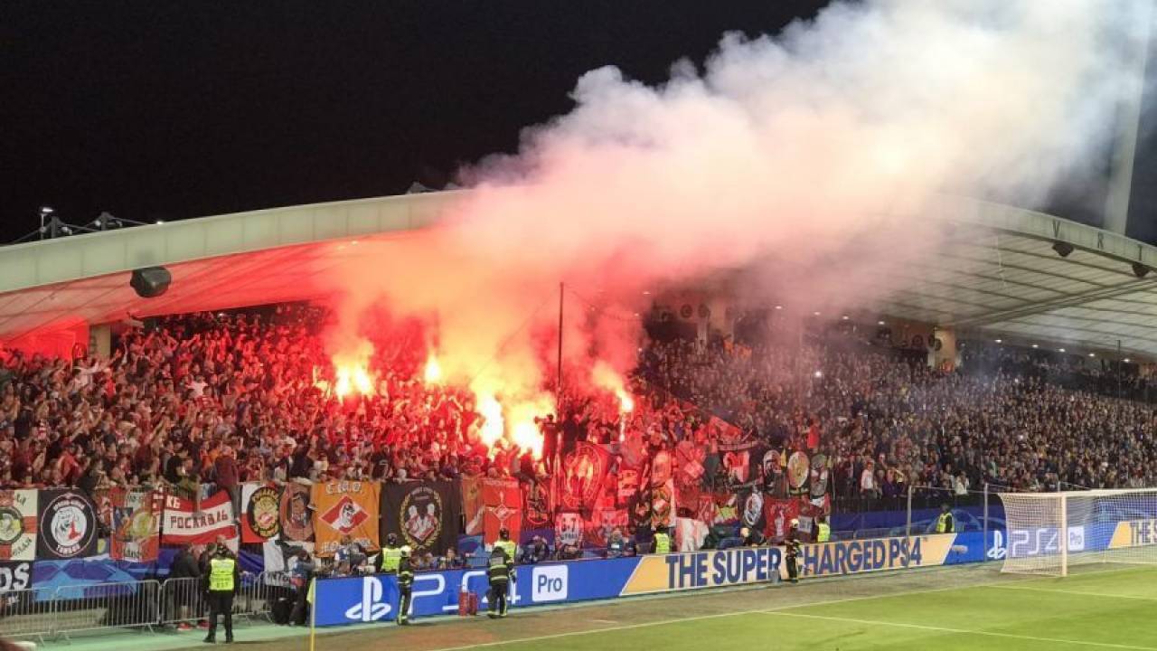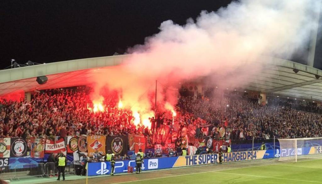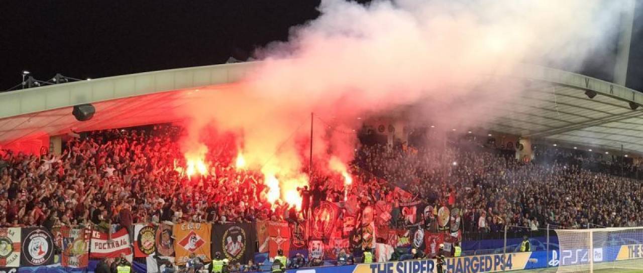 16'. Prekinitev tekme v Mariboru. Ruski navijači so prižgali bakle, na igrišče pa je priletelo nekaj pirotehnike.