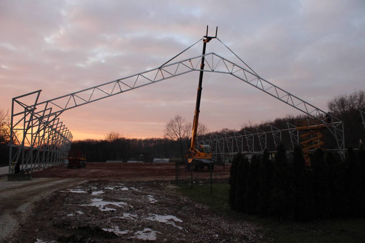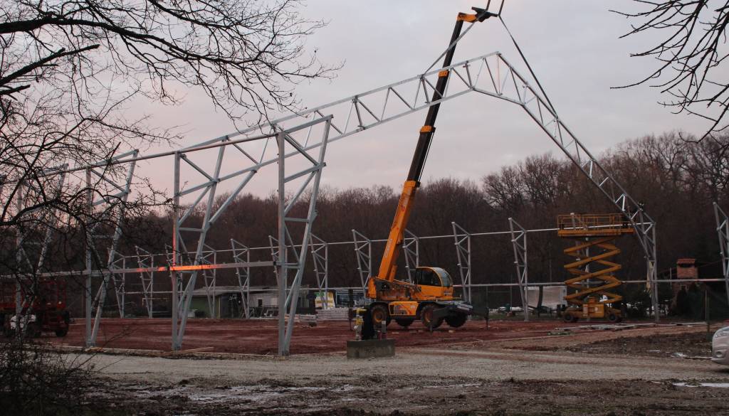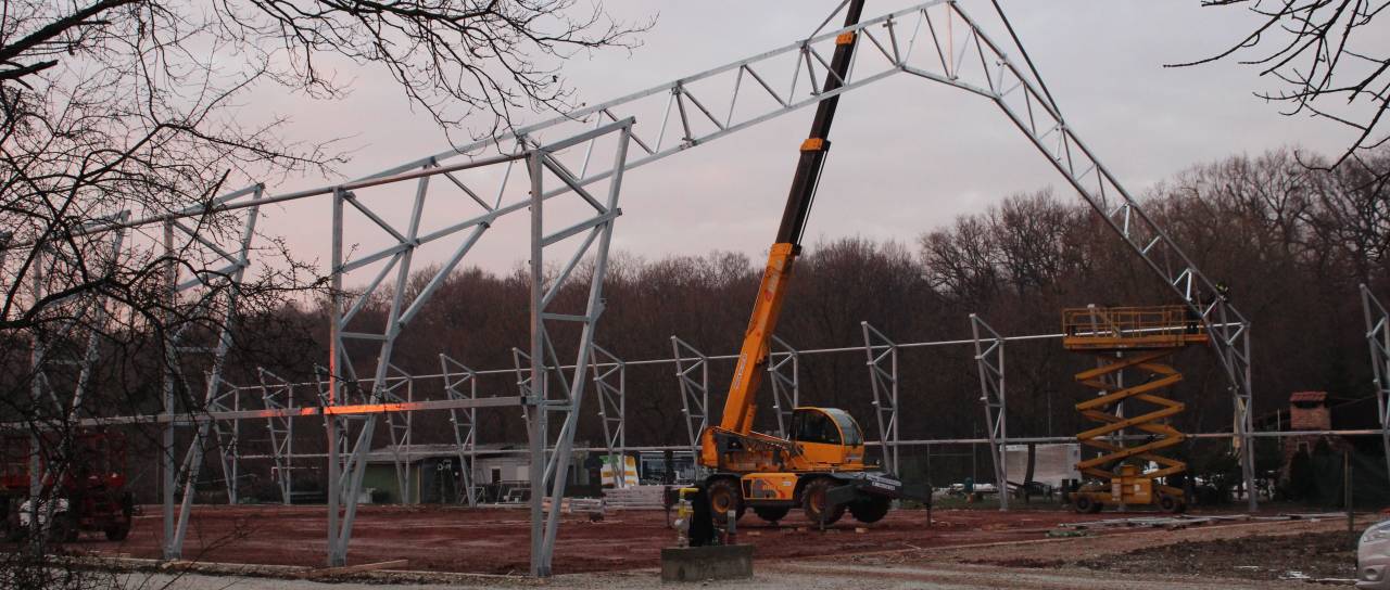 Dela v Fazaneriji so zdaj v polnem teku in kot priča priložena fotografija, ogrodje pokrite dvorane že stoji.