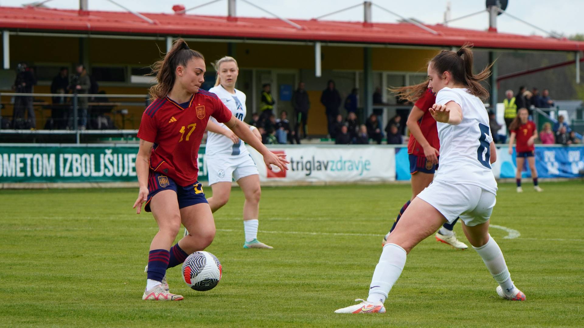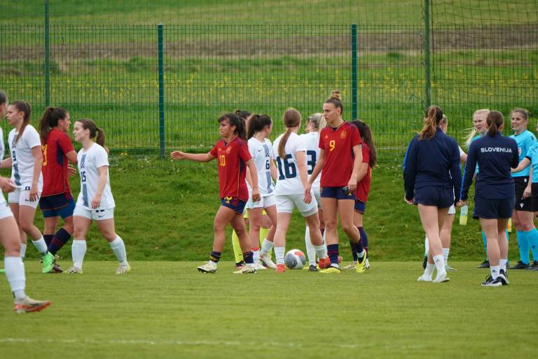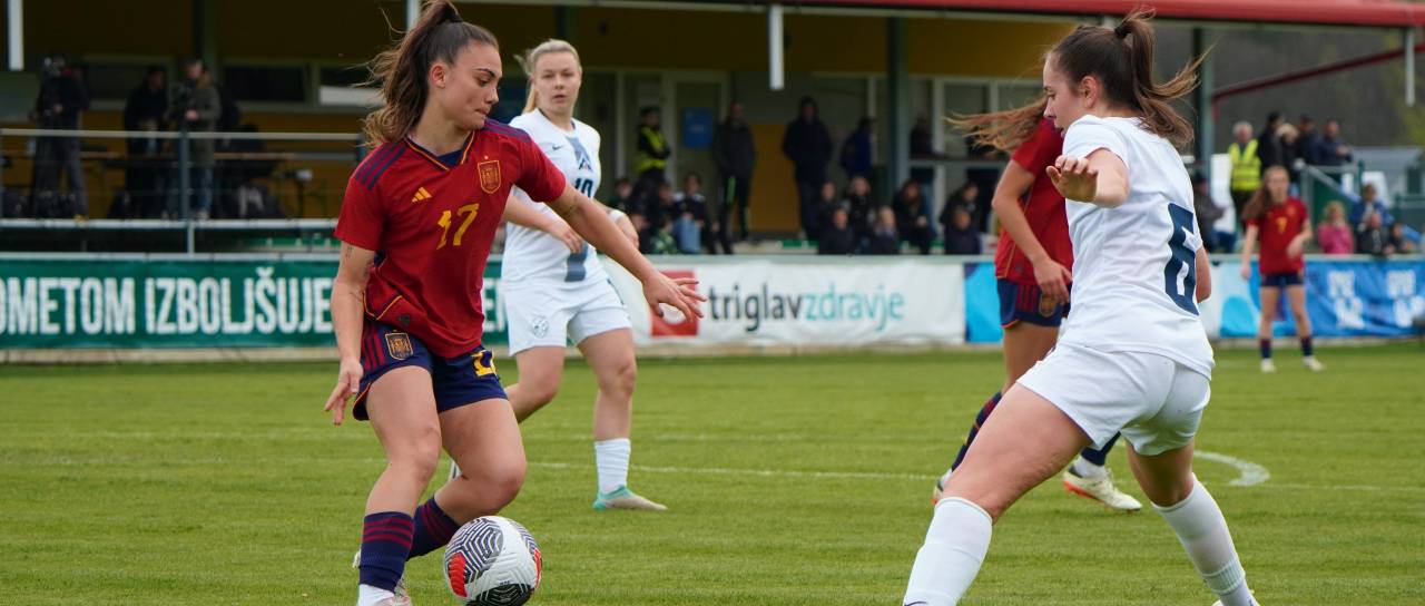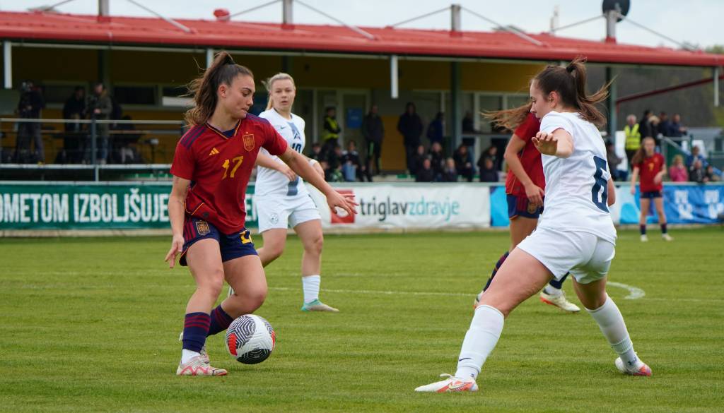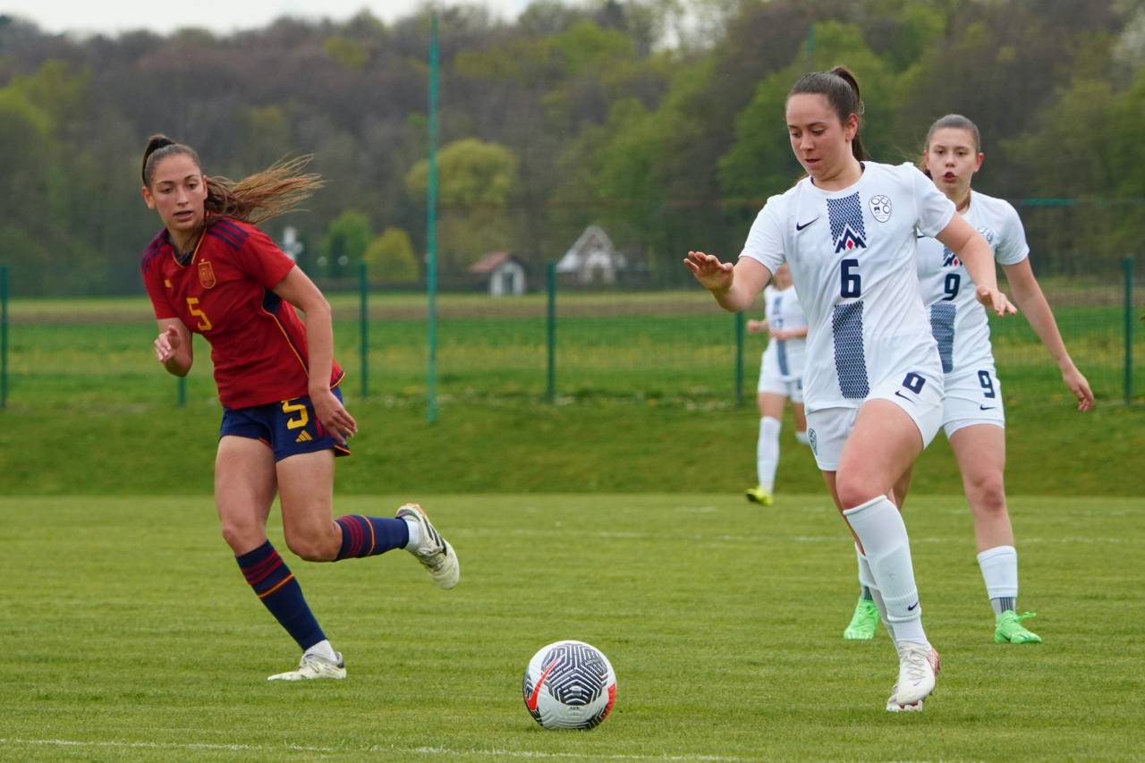 Španke so ob pomoči vetra hitro prevzele pobudo, povedle pa so v deveti minuti, ko je prosti strel s 23 metrov natančno izvedla Lucia Coralles. Nuša Vidrih je bila blizu, a vseeno za kakšen centimeter prekrat.