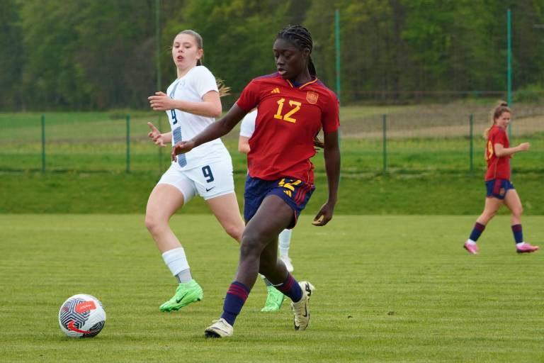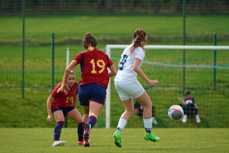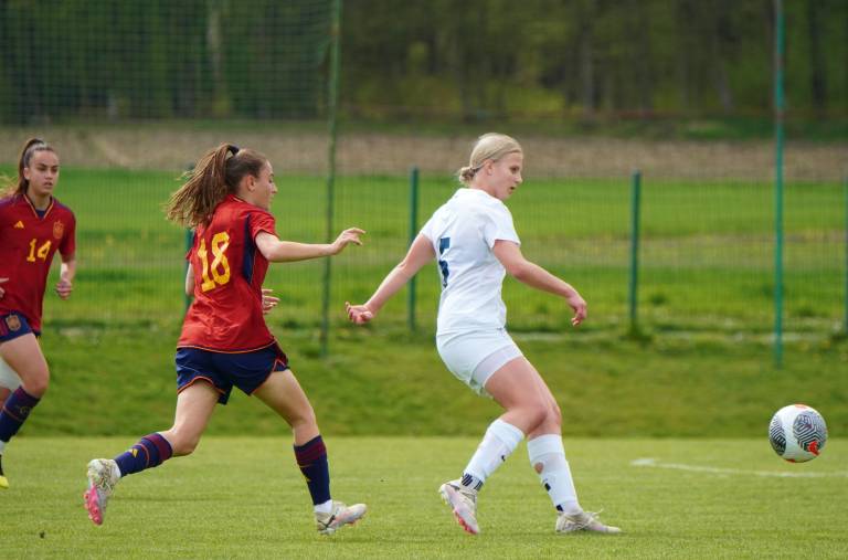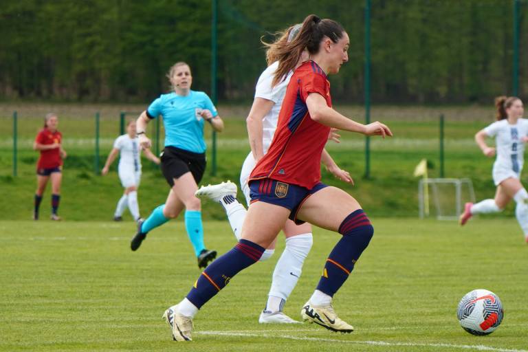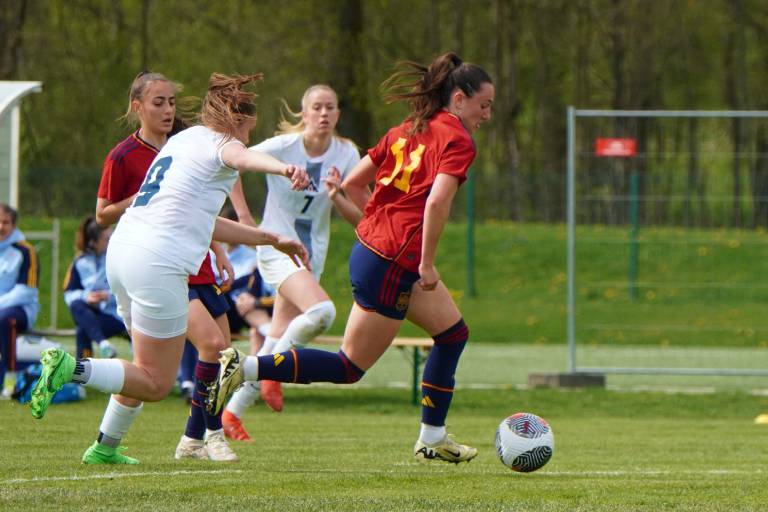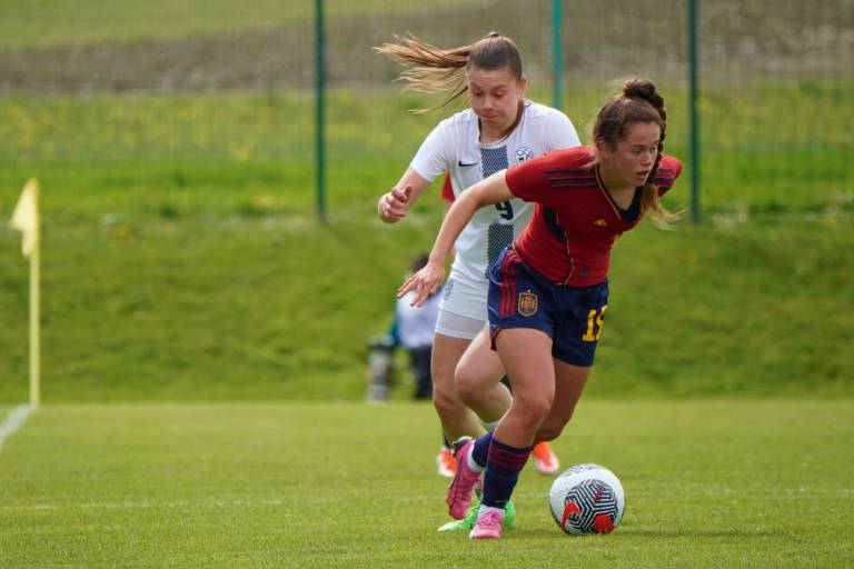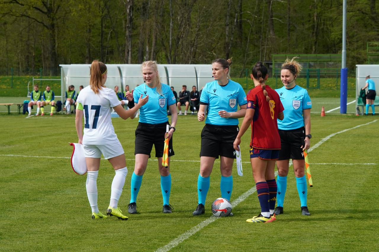 Španke so ob pomoči vetra hitro prevzele pobudo, povedle pa so v deveti minuti, ko je prosti strel s 23 metrov natančno izvedla Lucia Coralles. Nuša Vidrih je bila blizu, a vseeno za kakšen centimeter prekrat.