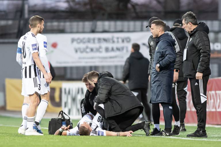 2' POŠKODBA! Timotej Brkić je obležal na zelenici, po posredovanju zdravniške službe je jasno, da ne bo nadaljeval srečanja.