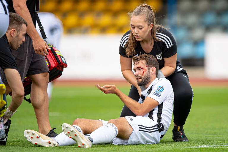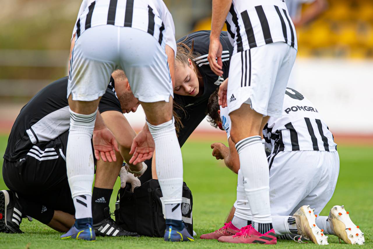 42' POŠKODBA! Klemen Pucko je po predložku v kazenski prostor Mure trčil s Tinom Hrvojem in s presekano arkado obležal na tleh. Posredovati mora zdravniška služba.