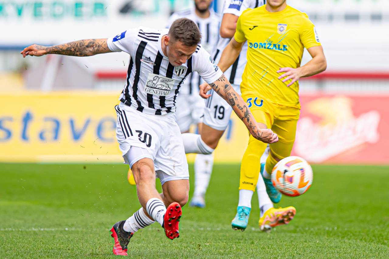 47' PRILOŽNOST! Domžalčani so zapravili priložnost za novo vodstvo! Arnel Jakupović je sijajno podal z desne strani, Franko Kovačević pa je z glavo z dveh metrov streljal mimo leve vratnice.