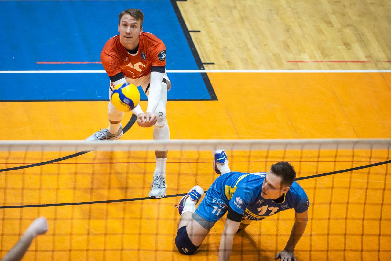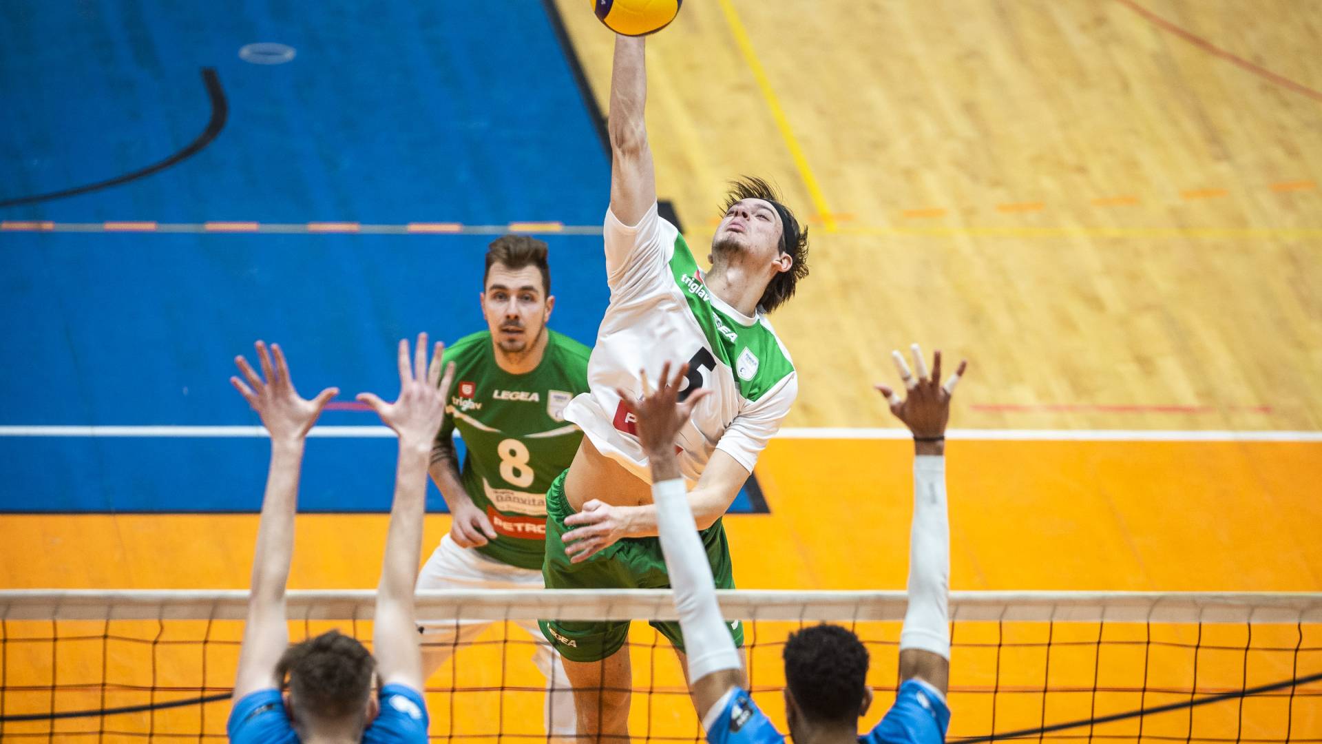 Prvi niz so bolje začeli odbojkarji Panvite Pomgrad, ki so z dobro igro prisilili domačega trenerja Sebastjana Škorca v prvi odmor na srečanju pri vodstvu s 2:6. V nadaljevanju niza so še stopnjevali ritem kar je bil povod za drugi odmor trenerja domačih Sebastjana Škorca pri rezultatu 9:14. Po nekaj dobrih zaključenih napadih in približanju na točko zaostanka je strateg Panvite Pomgrad posegel po drugem odmoru še pri vodstvu s 18:19. Domači so še stopnjevali ritem in po ključnih začetnih udarcih Uroša Planinšiča prišli na izenačenje 23:23. Po bloku Uroša Pavloviča so domači uspeli osvojiti niz s 27:25.