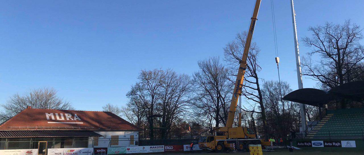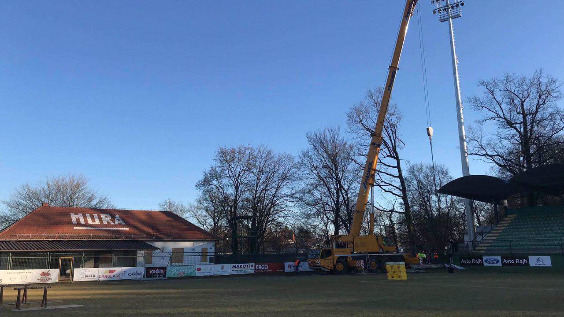 No, dela so danes vendarle ponovno stekla, reflektor pa bodo morali, preden ga bodo postavili v normalen položaj, vsaj dvakrat prestaviti. S tem bodo omilili škodo, ki bo nastala na zelenici. Reflektor naj bi dokončno začeli dvigati danes v popoldanskih urah.