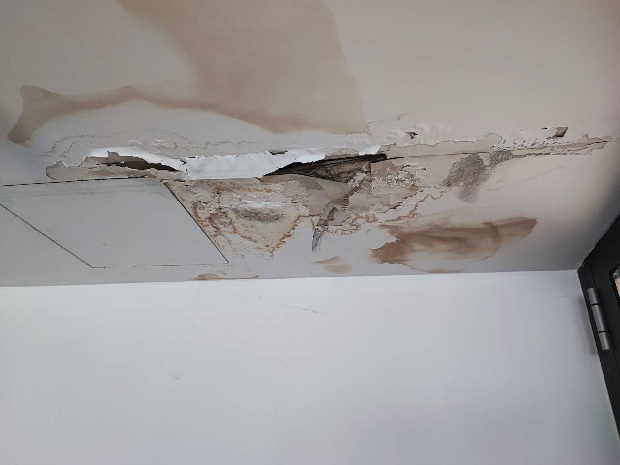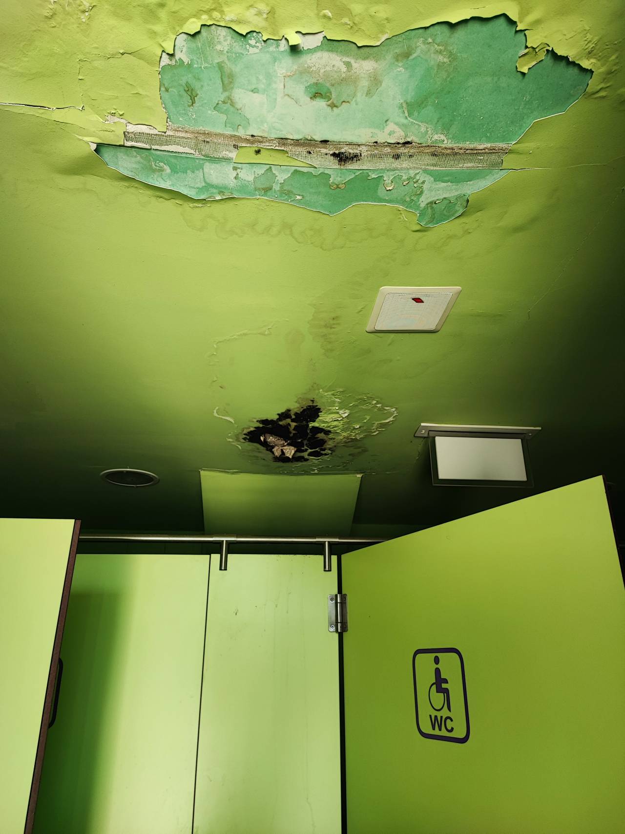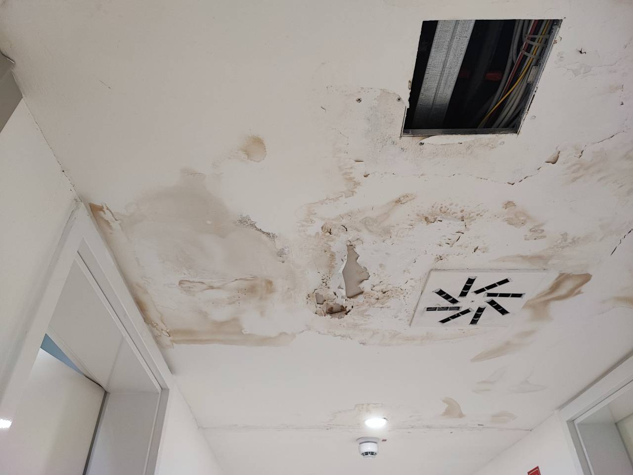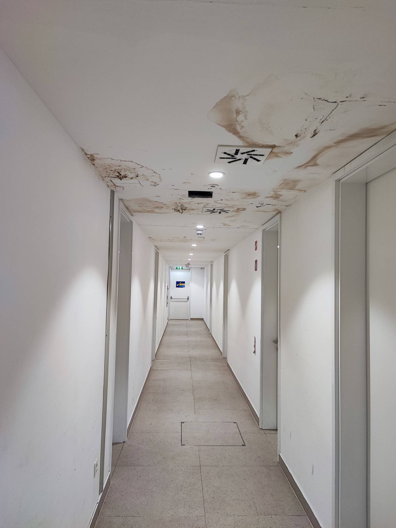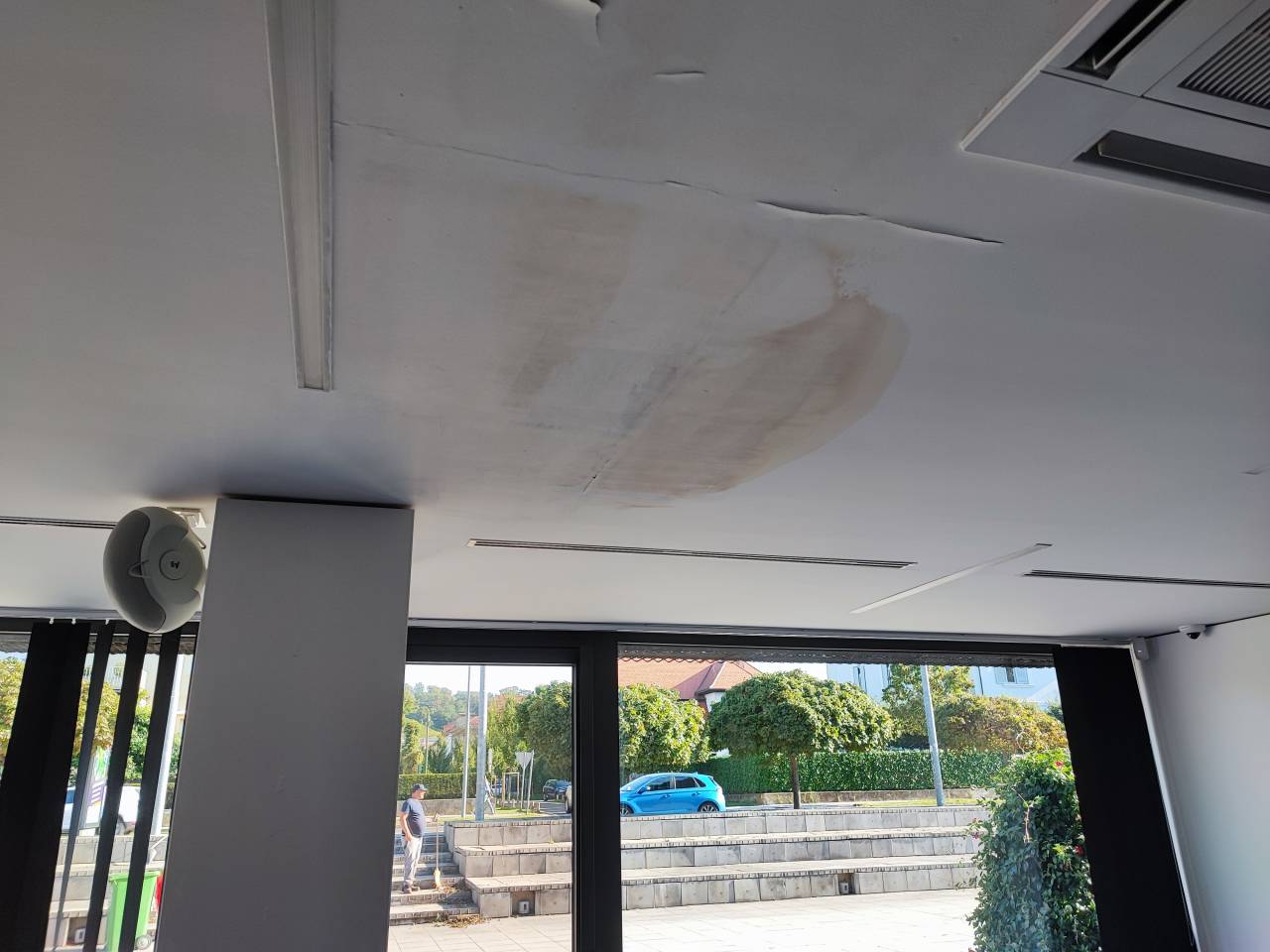 Voda pronica skozi strop in ob stenah, na nekaterih mestih tik ob električni napeljavi, razdelilnih omaricah ali pa tik nad tehniko za ozvočenje.
