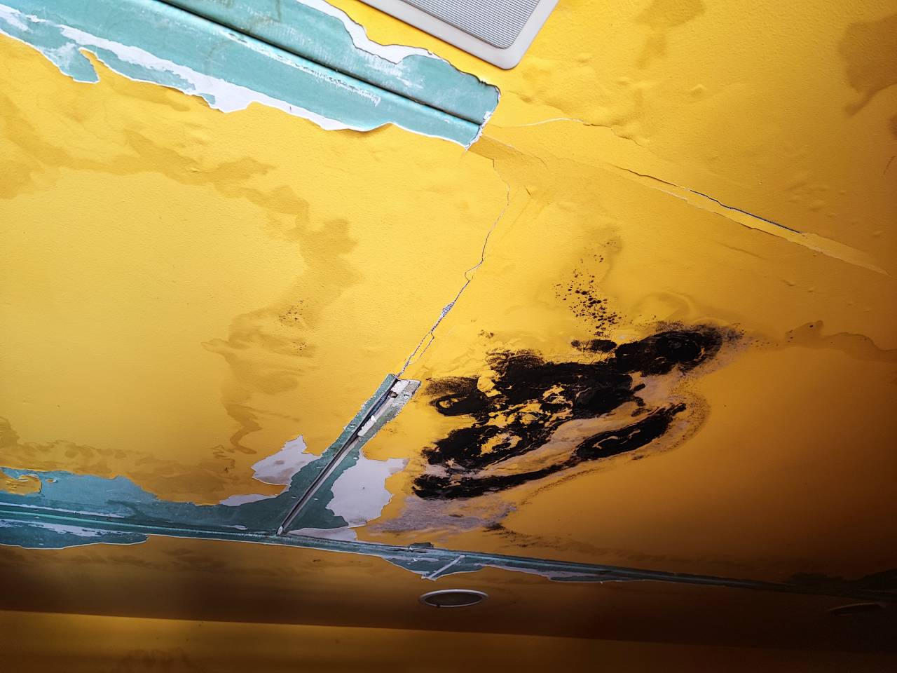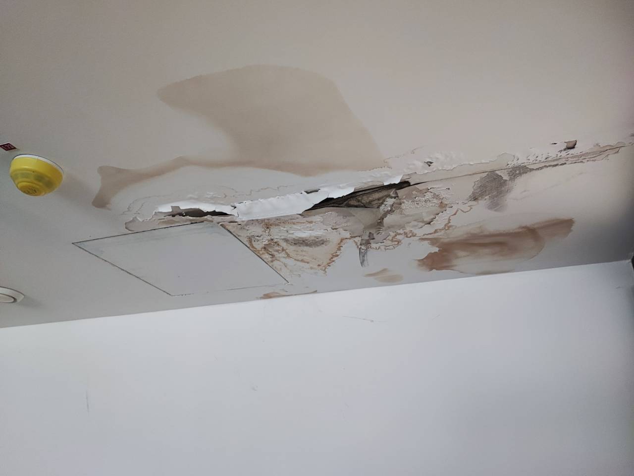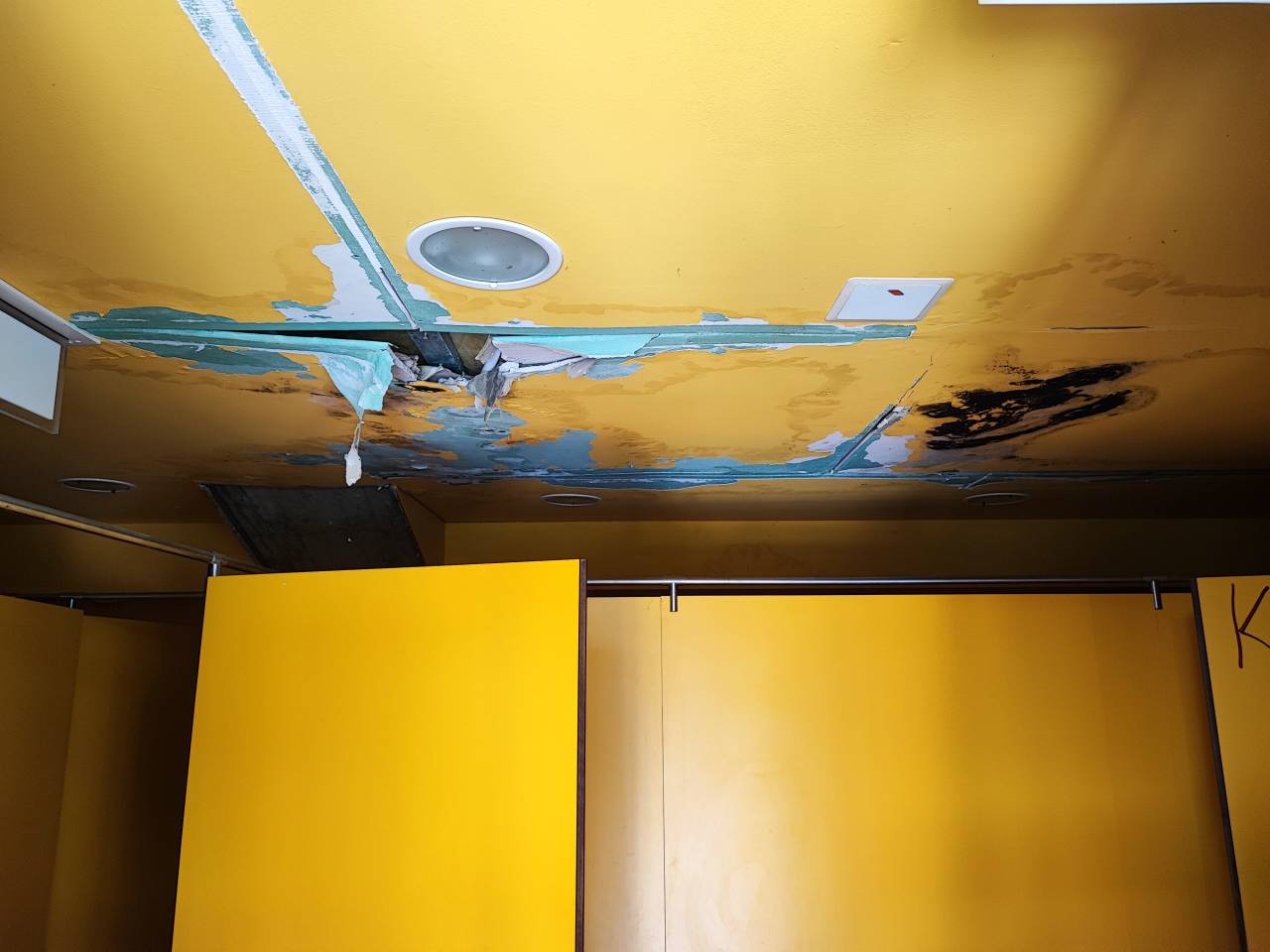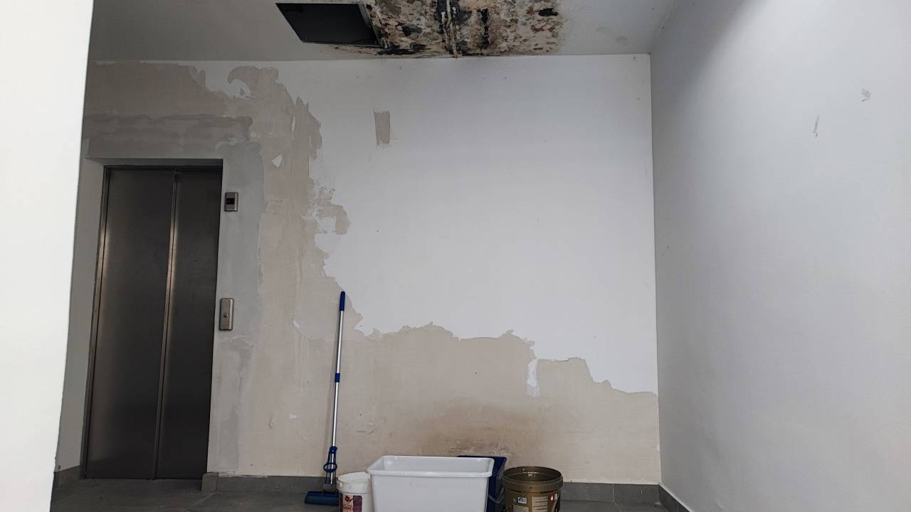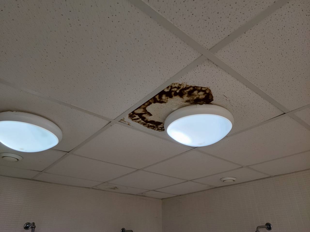 Voda pronica skozi strop in ob stenah, na nekaterih mestih tik ob električni napeljavi, razdelilnih omaricah ali pa tik nad tehniko za ozvočenje.