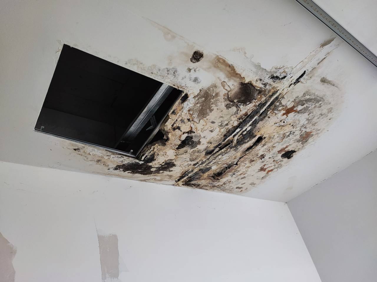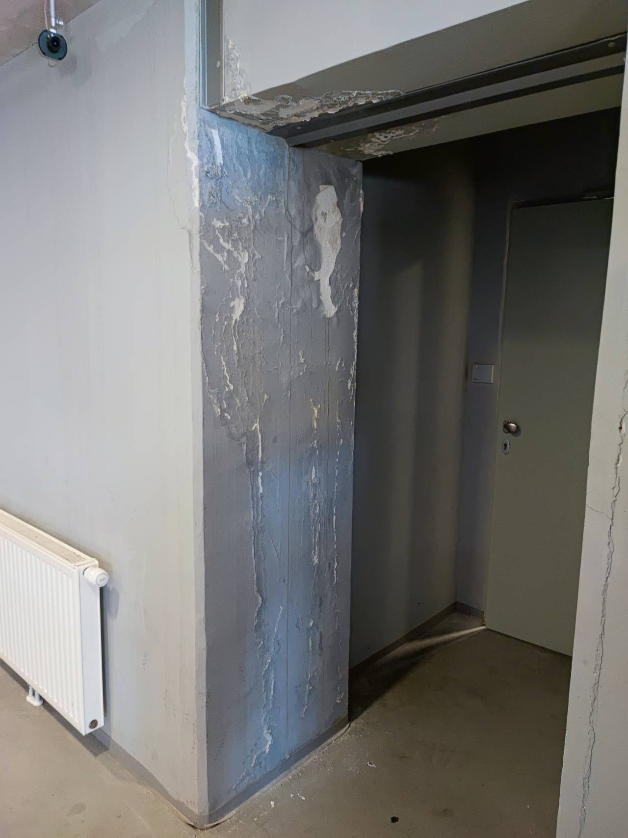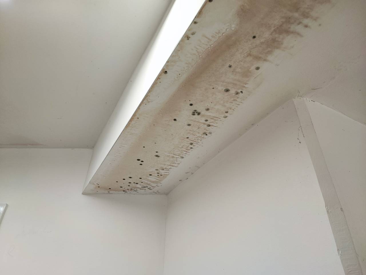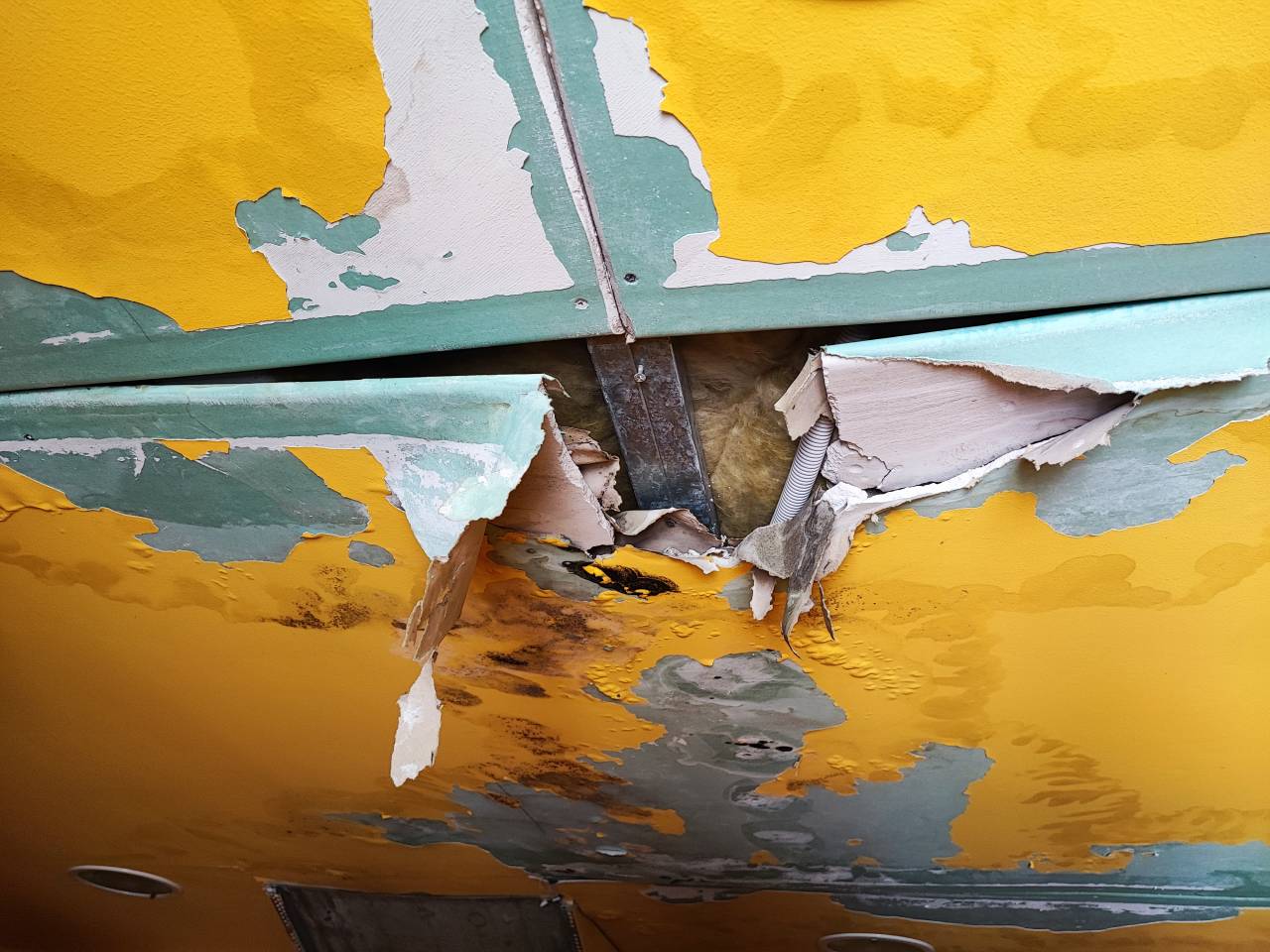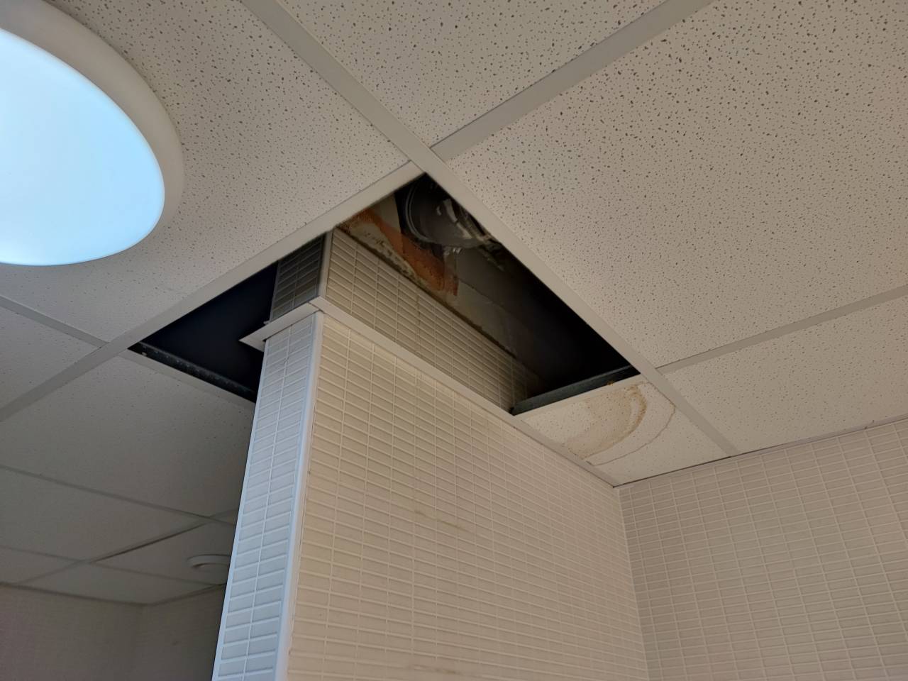 Voda pronica skozi strop in ob stenah, na nekaterih mestih tik ob električni napeljavi, razdelilnih omaricah ali pa tik nad tehniko za ozvočenje.