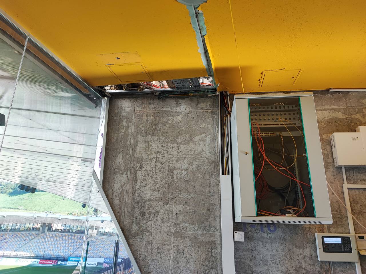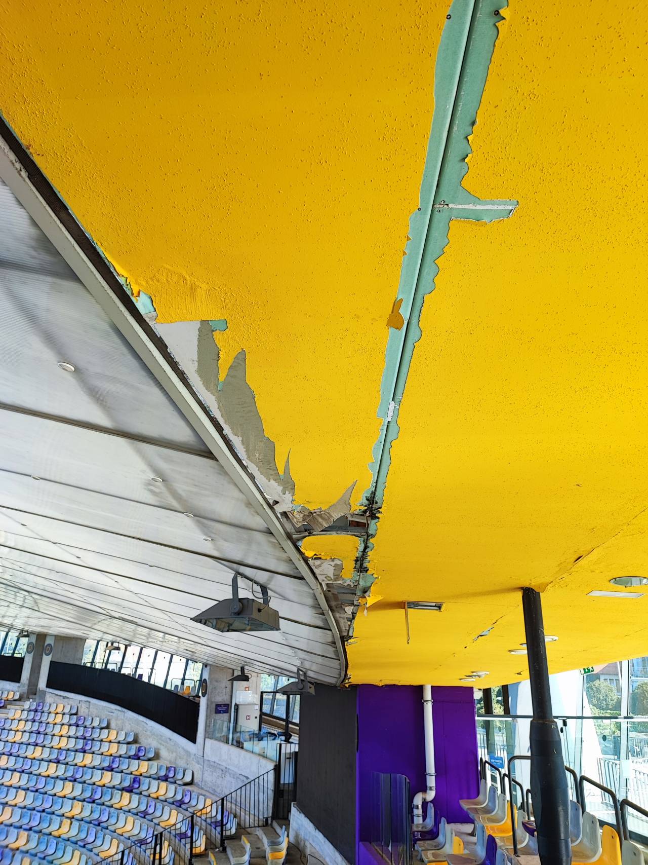 Ena od vrst z mizami je neuporabna, razen če želite, da vam vsakih nekaj sekund na glavo ali prenosni računalnik pade nekaj kapljic vode. Do težav pa prihaja tudi na ostalih delih stadiona, v pisarnah, hodnikih, prostorih za VIP, nekaj z vlago načetih stebrov pa je že »zacvetelo«.