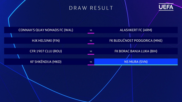 Na žrebu, ki je potekal danes v švicarskem Nyonu na sedežu Uefe, je bila Mura med nenosilci uvrščena v drugo skupino, možni nasprotniki so se tako skrčili na Cluj iz Romunije, Škendijo iz Severne Makedonije, Alaškert iz Armenije in Budućnost Podgorico iz Črne gore.