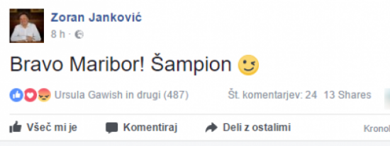 A očitno se je Jankovićeva objava na družbenem omrežju Facebook zdela preveč navdušena navijačem večnega rivala vijoličnih. To se je pokazalo že nekaj minut po objavi, ko je ljubljanski župan izbrisal zadnji del objave»Šampion.«