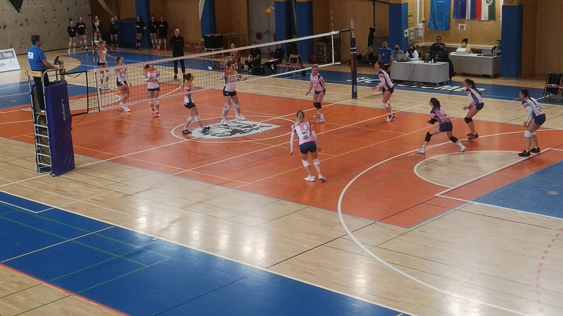Na začetku prvega niza so pobudo prevzele domače igralke, ki so povedle 6 : 3, predvsem po dobrih servisih Pintaričeve. Seveda se gostje niso predale in so po dveh uspešnih napadih Fišerjeve izid znižale na 6 : 5. Po dveh neuspešnih napadih domačink ter uspešnem napadu Grubišič Čabojeve so gostje povedle 8 : 10. Zato je reagiral domači trener in vzel minuto odmora, ki je koristila domačinkam, saj so po odličnem servisu Sakovičeve in prvem tempu Pintaričeve povedle 13 : 11. Pri rezultatu 15 : 13 je gostujoči trener zahteval minuto odmora. Po odmoru so domačinke dosegle dve zaporedni točki, zato je trener gostij moral vzel še drugo minuto odmora. Za tem so gostje zaigrale boje in povedle 18 : 19, ko je domači trener vzel še drugo minuto odmora. Sledile so tri zaporedne točke domačink. V napeti končnici pa se je po dveh zaporednih uspešnih napadih Sakovičeve set končal s 25 : 21 za domačinke.