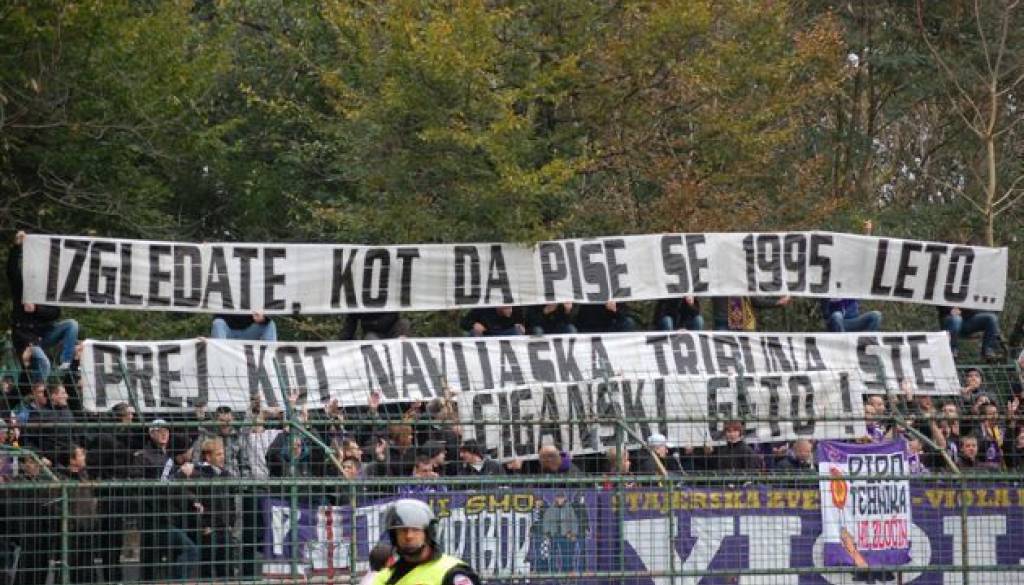 "Izgledate, kot da se piše 1995. leto... Prej kot navijaška skupina ste ciganski geto!," je pisalo na transparentu, ki so ga na tekmi proti Muri razvili navijači Maribora in svojemu klubu "priskrbeli" plačilo denarne kazni v višini 750 evrov. Tako je namreč odločil Simon Jeglič, disciplinski sodnik NZS, ki je v svojem pojasnilu zapisal: "Nešportno in neetično obnašanje organizirane navijaške skupine - navijači ekipe Maribor so v 6. minuti tekme na tribuni razvili transparent z žaljivo vsebino; upoštevana predkaznovanost".