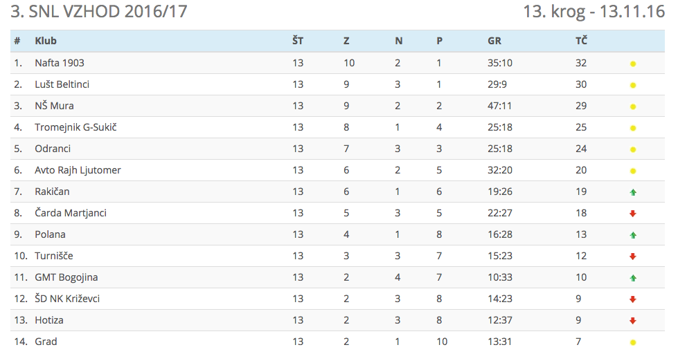 Za nami je trinajsti krog v tretji slovenski nogometni ligi vzhod, kar pomeni, da smo točno na polovici letošnjega prvenstva. Trenutno je v najboljšem položaju Nafta, ki pa v zadnjih tednih ne kaže več tako prepričljivih predstav kot na začetku prvenstva.