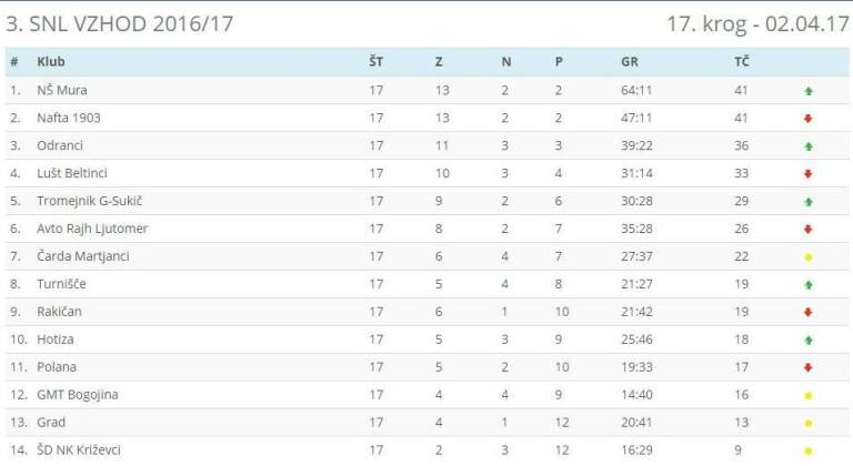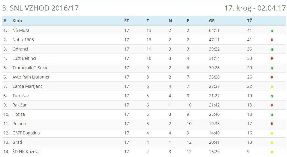 Beltinci, ki so bili po prvem delu sezone celo prvi zasledovalec Nafte, tonejo vse nižje. Z novim porazom, tokrat v Kuzmi pri Tromejniku, so padli že na četrto mesto, prehiteli so jih namreč Odranci. Domači so preko Roka Bokana in Roka Lovreca prišli do vodstva z 2 : 0, poraz "žutih" pa je omilil Mitja Mauko. Odranci so spodrsljal Beltinec znali izkoristiti in so tako ob Muri in Hotizi ekipa, ki je uspela zmagati na vseh treh tekmah spomladanskega dela. Odranci so doma ugnali Avto Rajh Ljutomer s 3 : 1 in se s 36-imi osvojenimi točkami nahajajo na tretjem mestu, za vodilnima Muro in Nafto pa zaostajajo za pet točk.