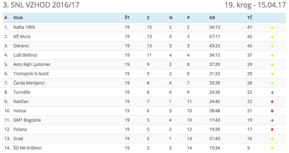 Za nami je devetnajsti krog v tretjeligaški druščini, po katerem je ponovno lahko najbolj zadovoljna lendavska Nafta. Ta je uspela slaviti na težkem gostovanju pri Hotizi in ob spodrsljaju Mure svoje vodstvo na prvem mestu povečala na visokih pet točk. Gostom, ki so slavili pri eni najbolj vročih ekip spomladi, sta zmago zagotovila Vedran Vinko in Marko Roginić. Na drugi strani je Mura še enkrata več razočarala na derbiju, tokrat proti Beltincem. Po porazu v Lendavi je četa Zlatka Gaborja na domačem terenu remizirala z "žutimi", ki so imeli večino igre, predvsem v drugem delu, več od igre. Črno-belim bi zmago v zadnji minuti sicer lahko zagotovil Rok Zorko, ki pa v dvoboju iz oči v oči s Stanislavom Kűzmo ni uspel zadeti. Mura je pred Beltinci tako zadržala pet točk prednosti, so se pa s črno-belimi točkovno izenačili Odranci.