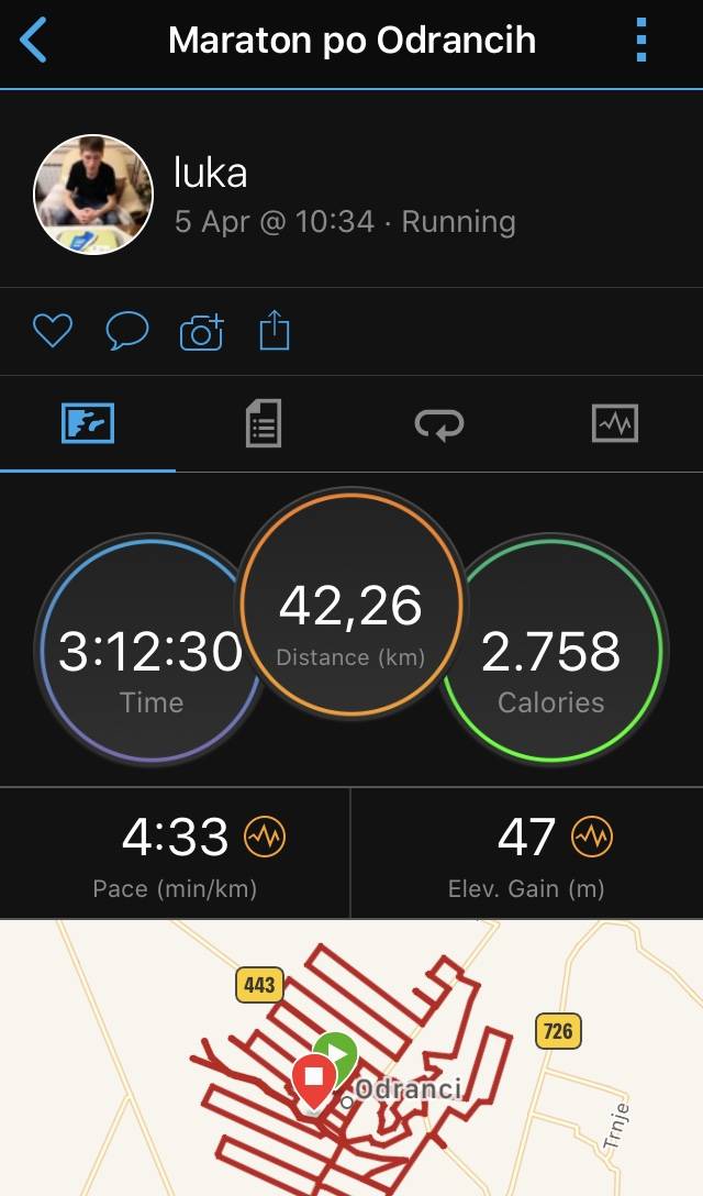 "Tek sem nadaljeval po odranskih ulicah. Domačini, ki so bili zunaj in me že pred časom videli teči, so mi namenili nekaj čudnih pogledov. Tako sem vztrajal in odtekel dolžino maratona in to po površinsko najmanjši občini v Sloveniji," opisuje svoj občudovanja vreden podvig.