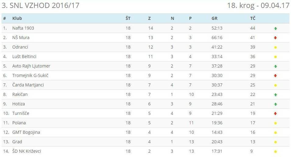 Podobno kot Odranci, so v drugem delu prvenstva s polnim izkupičkom le še nogometaši Hotize. Ti so ta konec tedna prepričljivo prišli do nove zmage, s 3 : 0 so bili boljši od Polane, velik del posla pa so opravili že v prvem polčasu, ko so vodili z 2 : 0. Do prve zmage spomladi pa je prišla ekipa Rakičana, ki je z 2 : 1 premagala zadnje Križevce. Ti tako ostajajo edina ekipa, ki spomladi še ni osvojila niti ene same točke.