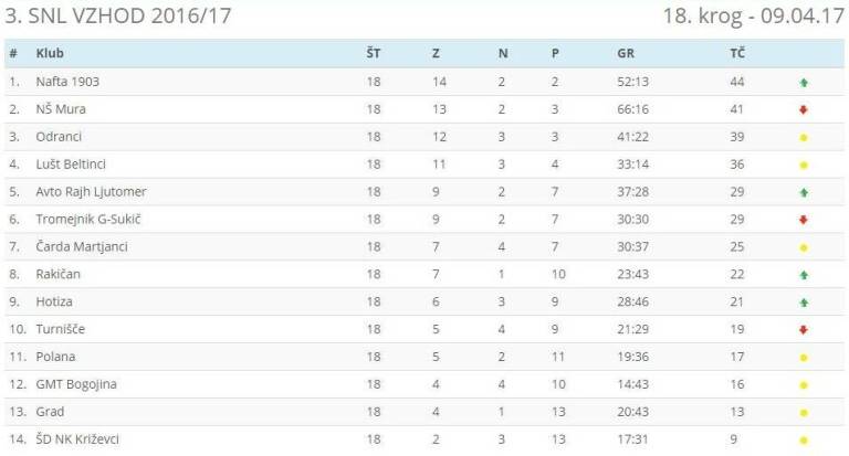 Za nami je osemnajst krogov v tretji slovenski nogometni ligi vzhod, na prvem mestu pa je znova prišlo do sprememba. Mura je vodilno pozicijo ponovno prepustila Nafti.