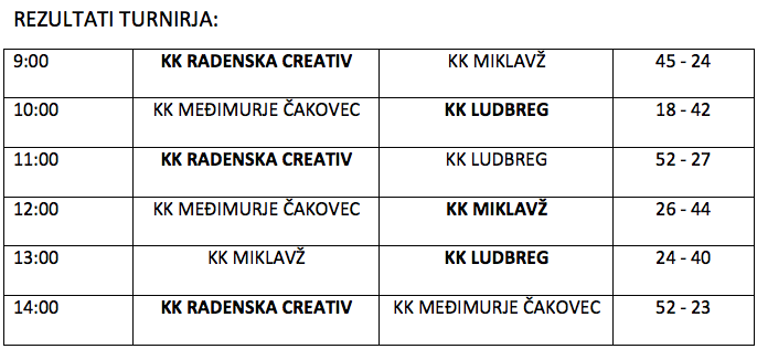 Drugo mesto na turnirju je zasedla ekipa KK Ludbreg iz Hrvaške, tretje KK Miklavž in četrto KK Međimurje Čakovec prav tako iz Hrvaške.