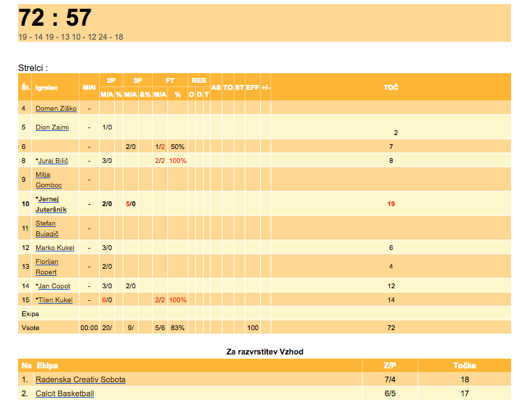 V 7. kolu razigravanja v 3. SKL so košarkarji Radenska Creativ Sobota premagali KK Bistrico z rezultatom 72:57.