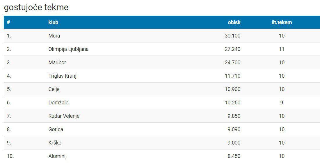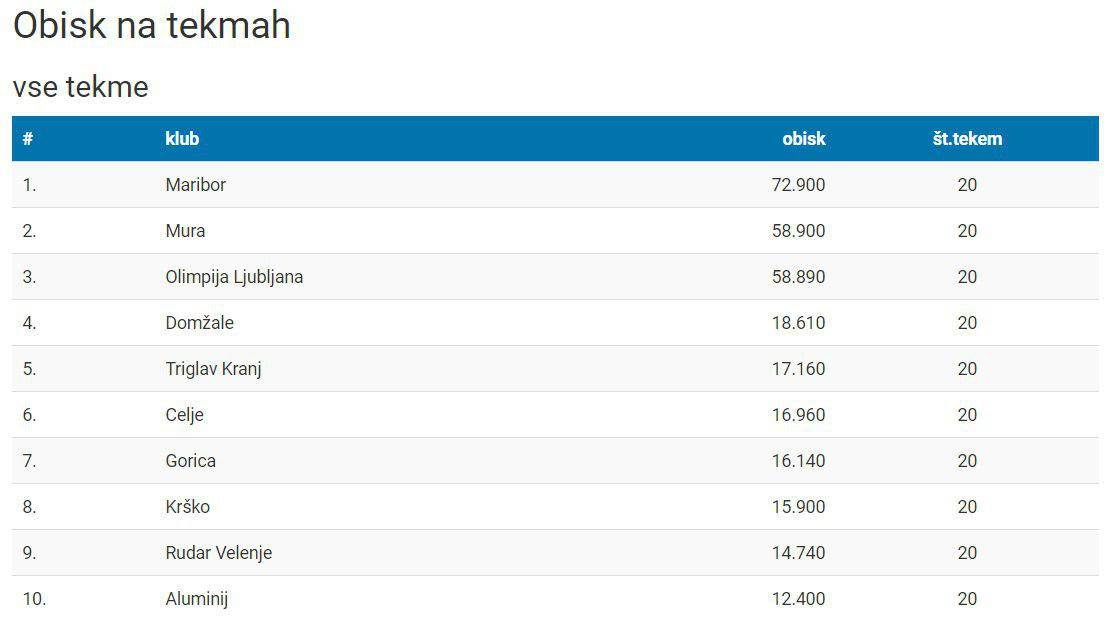 Tudi sicer pa je Mura po skupni gledanosti na drugem mestu, zaostaja namreč zgolj za Mariborom. Dvajset tekem vijoličastih si je ogledalo 72.900, tekme Mure pa 58.900 gledalcev. Na tretjem mestu je Olimpija z 58.890 gledalci.