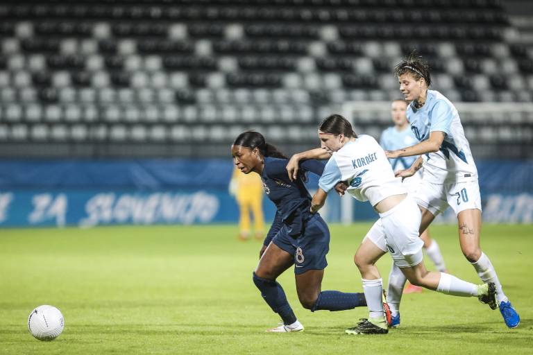 Slovenke so prednost držale do 28. minute. Amel Majri je po prekršku Kaje Korošec žogo poslala pred gol, v gneči pred slovenskimi vrati pa se je najbolje znašla Marie-Antoinette Katoto.