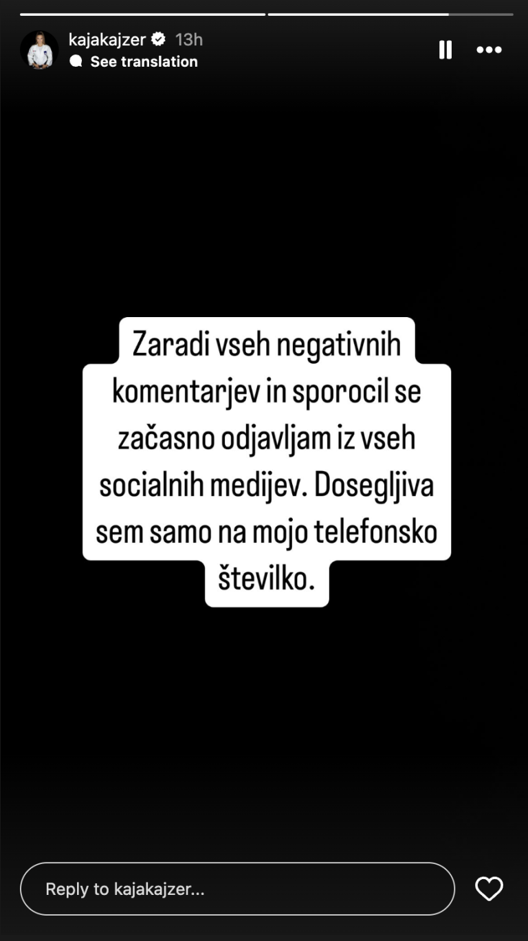 »Zaradi vseh negativnih komentarjev in sporočil se začasno odjavljam z vseh družbenih medijev. Dosegljiva sem samo na telefonsko številko,« je v zgodbi na Instagramu zapisala 24-letna tekmovalka.