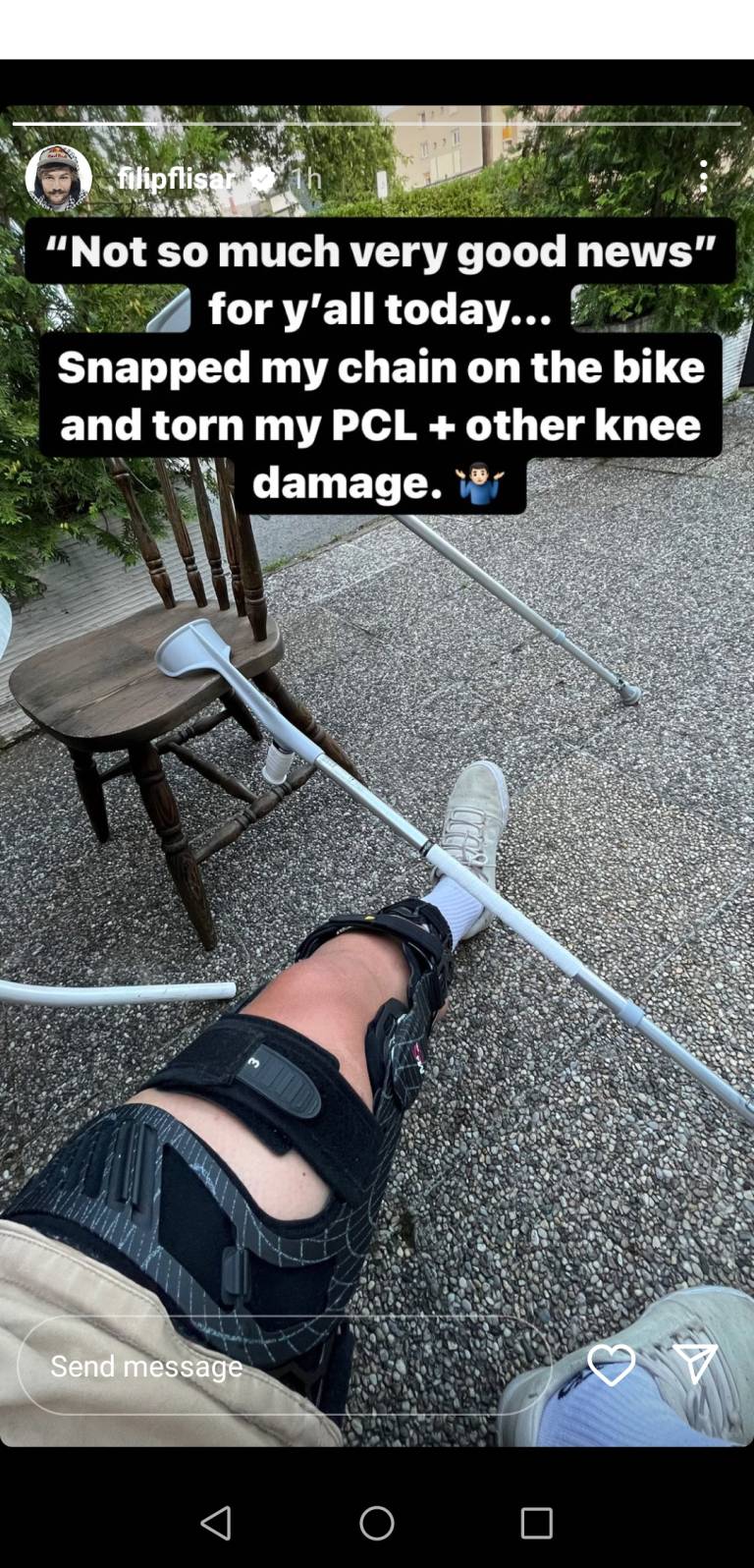 Vsestranski športnik je na svojem Instagram profilu s sledilci delil objavo, v kateri je zapisal, da se mu je na koleso strgala veriga, kar je vodilo v poškodbo kolena.