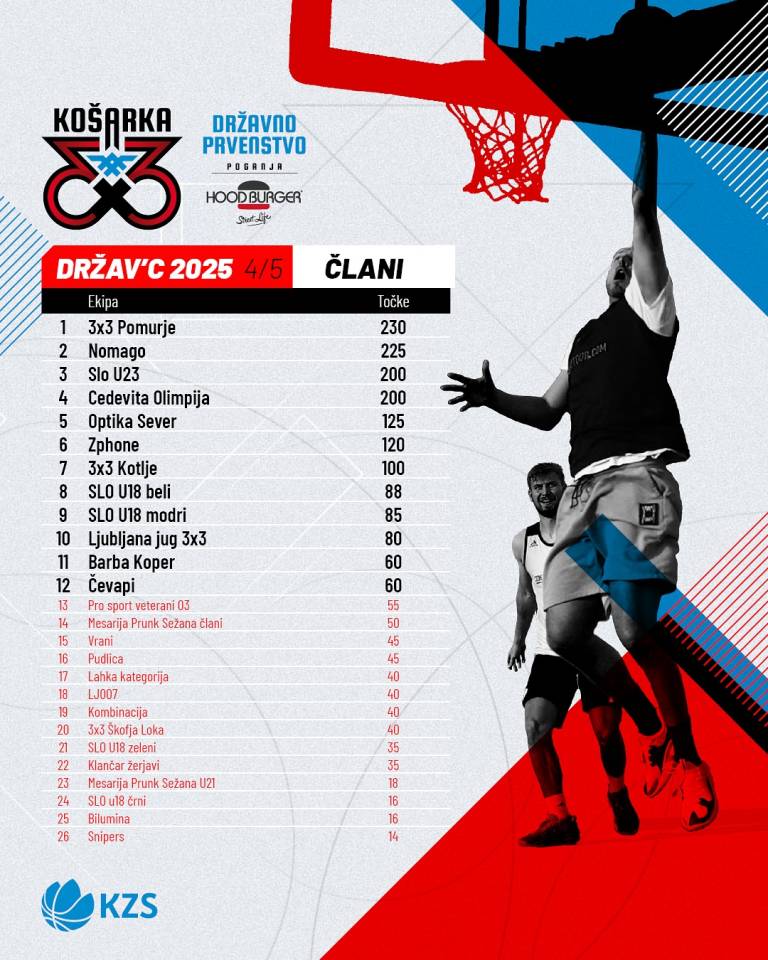 Pred večerno tekmo Slovenije in Nemčije se bo v Ljubljani odločalo o državnih prvakih v košarki tri na tri. V članski konkurenci vodi ekipa tri na tri Pomurje.