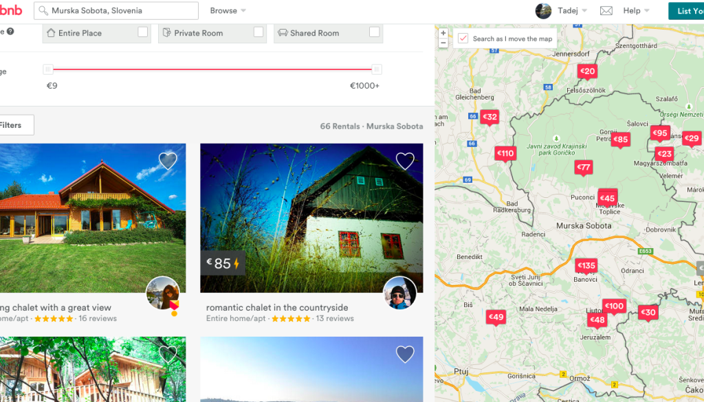 V Pomurju se je število nepremičnin, ki so na voljo za najem preko Airbnb v zadnje pol leta močno dvignilo. Trenutno lahko v Pomurju naštejemo 20 ponudb, a nekateri med njimi niso ravno neprofesionalni, temveč registrirani ponudniki turističnih storitev. Veliko je vikendov oziroma počitniških hišic, ki jih lastniki redko uporabljajo. Cenovni razpon je velik. Za 33 evrov na noč lahko denimo najamete hišico v Lendavskih goricah, kjer lahko prespi pet ljudi, za 171 evrov na noč veliko hišo v Selu, kjer lahko v osmih spalnicah prespi več kot 16 ljudi, za 77 evrov na noč lahko najamete luksuzno brunarico na Vaneči z odličnim razgledom na Mursko Soboto, kjer lahko prespi pet ljudi. Daleč najdražja ponudba za območje Pomurja je vila v Banovcih, kjer lahko v petih spalnicah prespi 12 ljudi, za kar bodo odšteli 675 evrov