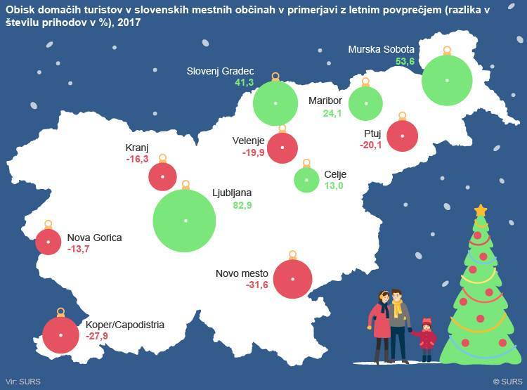 Največji pribitek seveda zasledimo v Mestni občini Ljubljana, kjer so decembra lani zabeležili 82,9 odstotka višji obisk od mesečnega povprečja v letu. V Slovenj Gradcu je povečanje bilo 41,3-odstotno, v Mariboru 24,1-odstotno in v Celju 13,7-odstotno. V preostalih mestnih občinah je obisk medtem bil večji v ostalih mesecih.