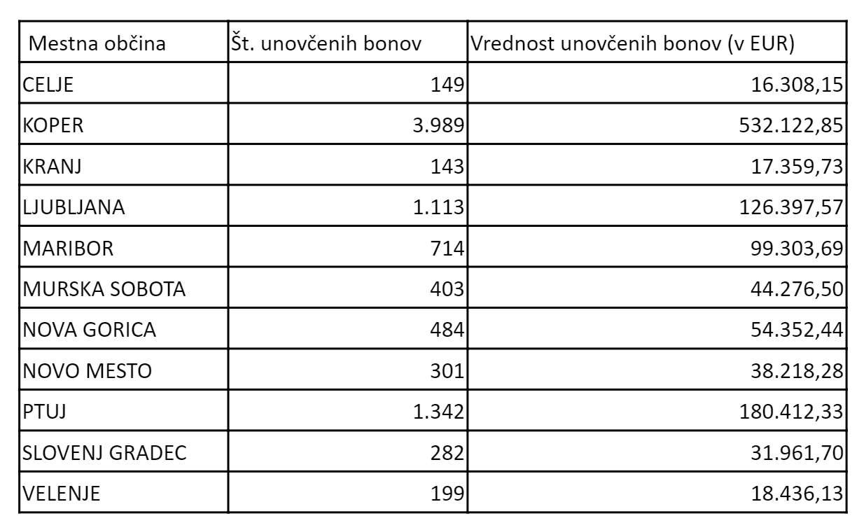 Nepresenetljivo so najmanj bonov zapravili prebivalci občine Hodoš, ki šteje zgolj okoli 360 prebivalcev. Občani te pomurske občine so tako z boni ustvarili vrednost 1.250 evrov.