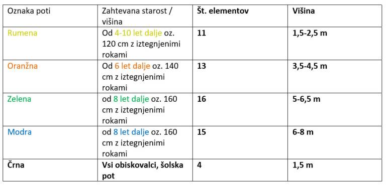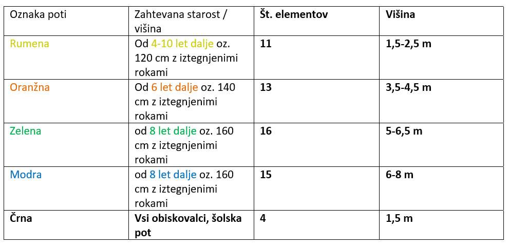 Plezalne poti so prilagojene glede na starost in zmogljivost in so tako primerne za najmlajše, kakor tudi za najstarejše. Najnižji elementi so visoki 1,5 metrov, najvišji pa kar 8 metrov! Za vse izziva željnih je tu Štorkljin let, z razponom kar 27 metrov.