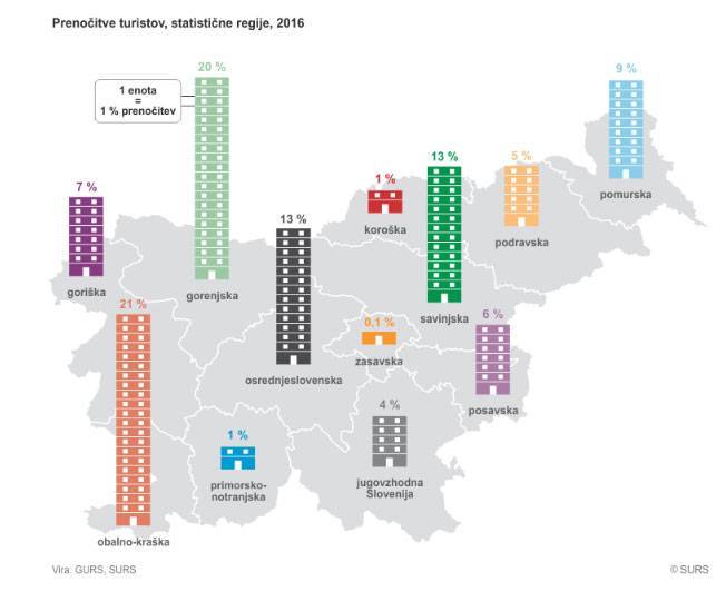 V državi vsako leto naštejemo več turistov. Leta 2016 je bilo število prenočitev za 26 odstotkov višje kot leta 2010, število prihodov turistov pa kar za neverjetnih 43 odstotkov. Tako smo zabeležili 11,2 milijona prenočitev turistov, pri čemer so se največ obiskov razveselili na Gorenjskem, število prenočitev pa je bilo najvišje v obalno-kraški statistični regiji. In Pomurje?