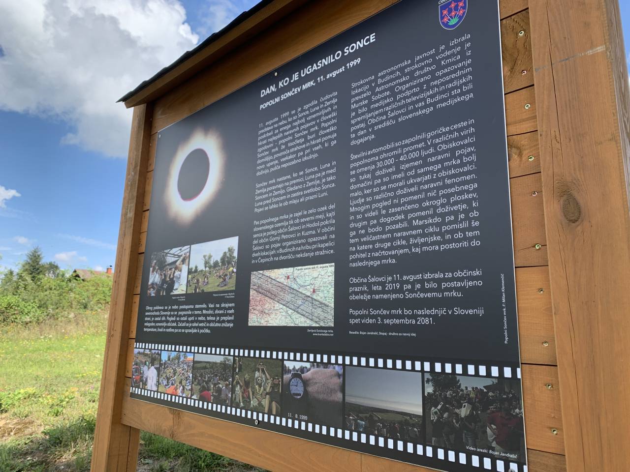 Izbira prve točke ni bila naključna. Travnik ob manjši kapelici iz leta 1855 in tristo let starem kostanju je bil pred dobrimi 21. leti namreč osrednje prizorišče opazovanja popolnega sončevega mrka. Enega najbolj vznemirljivih naravnih pojavov naj bi si takrat na severu Goričkega ogledalo do 40.000 ljudi. Občina Šalovci, ki 11. avgusta praznuje tudi svoj občinski praznik, je lani tu postavila spominsko obeležje namenjeno Sončevemu mrku, Društvo za razvoj idej Stopaj pa je letos dodalo še informacijsko tabko, ki pod naslovom “Dan, ko je ugasnilo sonce” razlaga takratne dogodke.