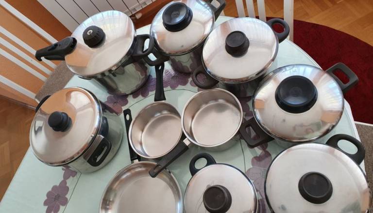 Prodam posodo - 25 kosov - iz nerjavečega materiala, nekatere s premazom ali iz železne litine sicer: - 6 loncev - 1 zelo velik, 2 velika, 2 nižja, 1 manjši - 6 pokrovk za lonce - 2 kozici z daljšim...