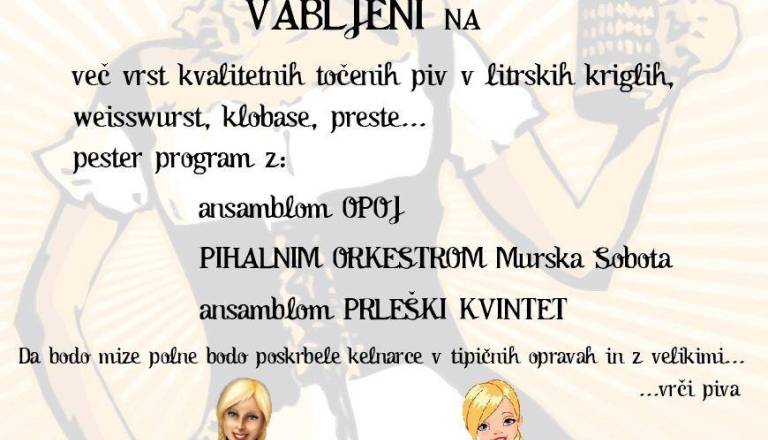 Vabljeni na že 3. tradicionalni pomurski Oktober-Fest. Pridite in poizkusite kvalitetna točena piva, prave oktoberfestovske jedi in uživajte ob domači glasbi v ...