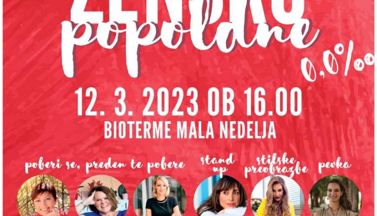 Žensko popoldne, 12. marec 2023, ob 16.00, Bioterme Mala Nedelja Program ŽENSKEGA POPOLDNEVA: 1. Registracija in dobrodošlica 2. Okrogla miza: "Poberi se ...