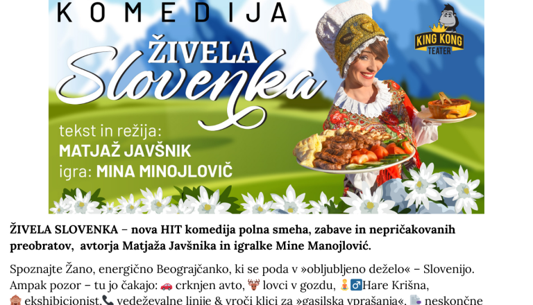 🎭 Komedija ŽIVELA SLOVENKA 📅 petek, 26. September 2025 🕖 Ob 20:00 📍 Hotel Bioterme Beograjčanka Žana, ki v iskanju boljšega življenja pristane v Sloveniji... a ...
