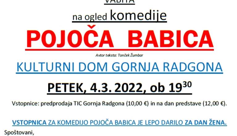 V Gornjo Radgono se vračajo stari znanci ljubiteljev komedij, KUD Veseli oder oz. KD Simon Gregorčič. S komedijo Pojoča babica nas bodo v Domu kulture Gornja ...