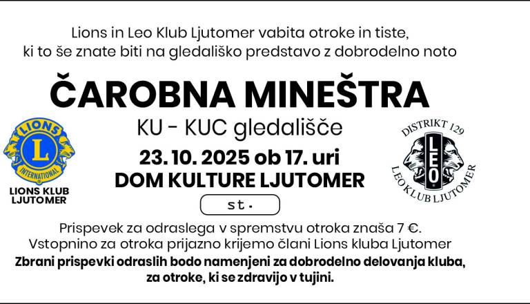 Lions in Leo klub Ljutomer vabita otroke in tiste, ki to še znate biti na gledališko predstavo z dobrodelno noto. Predstava z naslovom Čarobna mineštra, bo v ...