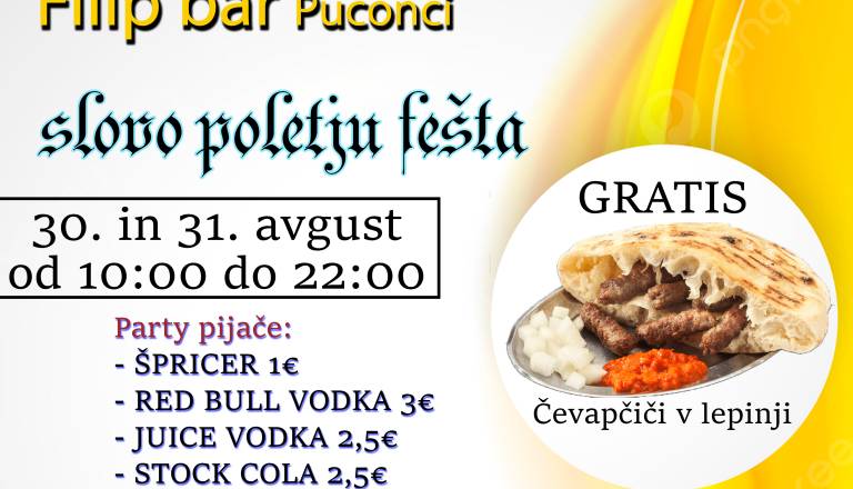 Slovo poletju Fešta z gratis hrano, dobro glasbo, parti pijačo. Vljudno vabljeni vsi dobre volje.