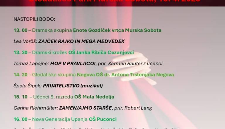 Vljudno vabljeni na Plesne vizije – regijsko revijo mladinskih plesnih skupin, ki bo potekala v Gledališču Park Murska Sobota, v torek 20. 5. 2025, ob 12.30 ...